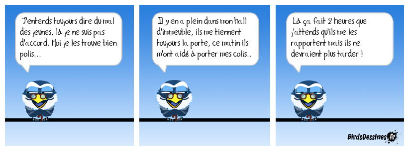Case 1:Bird 1: J'entends toujours dire du mal des jeunes, là je ne suis pas d'accord. Moi je les trouve bien polis... | Case 2: Bird 1: Il y en a plein dans mon hall d'immeuble, ils me tiennent toujours la porte, ce matin ils m'ont aidé à porter mes colis.. | Case 3: Bird 1: Là ça fait 2 heures que j'attends qu'ils me les rapportent mais ils ne devraient plus tarder !
