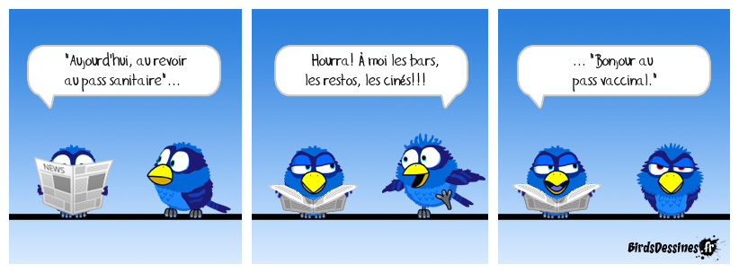 Case 1:Bird 1: "Aujourd'hui, au revoir au pass sanitaire"... | Case 2: Bird 1: Hourra! À moi les bars, les restos, les cinés!!! | Case 3: Bird 1: ... "Bonjour au pass vaccinal."