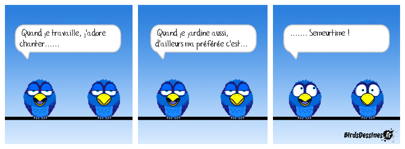 Case 1:Bird 1: Quand je travaille, j'adore chanter...... | Case 2: Bird 1: Quand je jardine aussi, d'ailleurs ma préférée c'est... | Case 3: Bird 1: ....... Semeurtime !