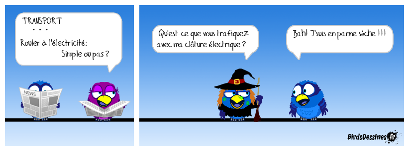 Case 1:Bird 1: TRANSPORT * * * Rouler à l'électricité: Simple ou pas ? | Case 2: Bird 1: Qu'est-ce que vous trafiquez avec ma clôture électrique ? | Case 3: Bird 1: Bah! J'suis en panne sèche !!!