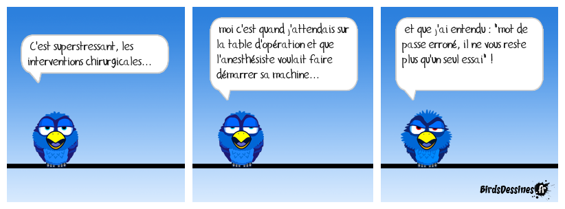 Case 1:Bird 1: C'est superstressant, les interventions chirurgicales... | Case 2: Bird 1: moi c'est quand j'attendais sur la table d'opération et que l'anesthésiste voulait faire démarrer sa machine... | Case 3: Bird 1: et que j'ai entendu : "mot de passe erroné, il ne vous reste plus qu'un seul essai" !
