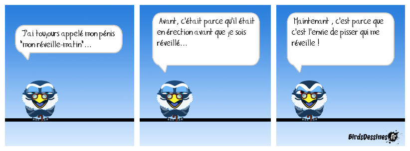 Case 1:Bird 1: J'ai toujours appelé mon pénis "mon réveille-matin"... | Case 2: Bird 1: Avant, c'était parce qu'il était en érection avant que je sois réveillé... | Case 3: Bird 1: Maintenant , c'est parce que c'est l'envie de pisser qui me réveille !