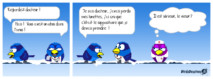Case 1:Bird 1: Regardez docteur !Bird 2: Mais ! Vous avez un obus dans l'anus ! | Case 2: Bird 1: Je sais docteur, j'avais perdu mes lunettes, j'ai cru que c'était le suppositoire que je devais prendre ! | Case 3: Bird 1: Il est sérieux, le vieux ?