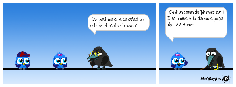 Case 1: | Case 2: Bird 1: Qui peut me dire ce qu'est un cubitus et où il se trouve ? | Case 3: Bird 1: C'est un chien de BD monsieur ! Il se trouve à la dernière page du Télé 7 jours !