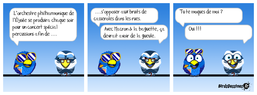 Case 1:Bird 1: L’orchestre philharmonique de l’Èlysée se produira chaque soir pour un concert spécial percussions afin de .... | Case 2: Bird 1: ....s’opposer aux bruits de casseroles dans les rues. Bird 2: Avec Macron à la baguette, ça devrait avoir de la gueule. | Case 3: Bird 1: Tu te moques de moi ? Bird 2: Oui !!!