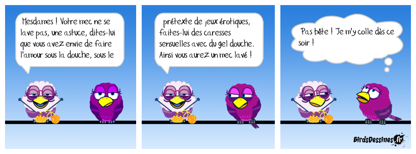 Case 1:Bird 1: Mesdames ! Votre mec ne se lave pas, une astuce, dites-lui que vous avez envie de faire l'amour sous la douche, sous le | Case 2: Bird 1: prétexte de jeux érotiques, faites-lui des caresses sensuelles avec du gel douche. Ainsi vous aurez un mec lavé ! | Case 3: Bird 1: Pas bête ! Je m'y colle dès ce soir !