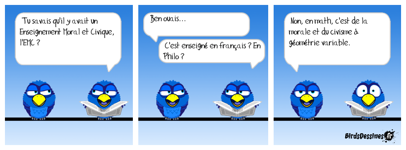 Case 1:Bird 1: Tu savais qu'il y avait un Enseignement Moral et Civique, l'EMC ? | Case 2: Bird 1: Ben ouais... Bird 2: C'est enseigné en français ? En Philo ? | Case 3: Bird 1: Non, en math, c'est de la morale et du civisme à géométrie variable.