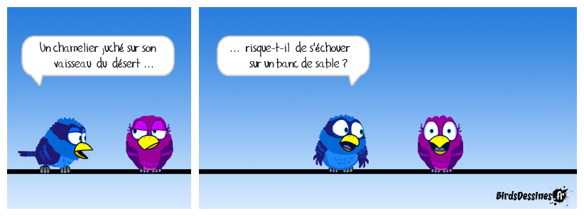 Case 1:Bird 1: Un chamelier juché sur son vaisseau du désert ... | Case 2: Bird 1: ... risque-t-il de s'échouer sur un banc de sable ? | Case 3: