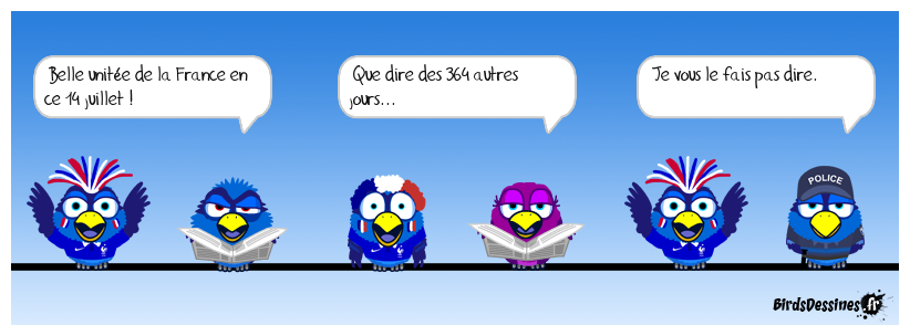 Case 1:Bird 1: Belle unitée de la France en ce 14 juillet ! | Case 2: Bird 1: Que dire des 364 autres jours... | Case 3: Bird 1: Je vous le fais pas dire.