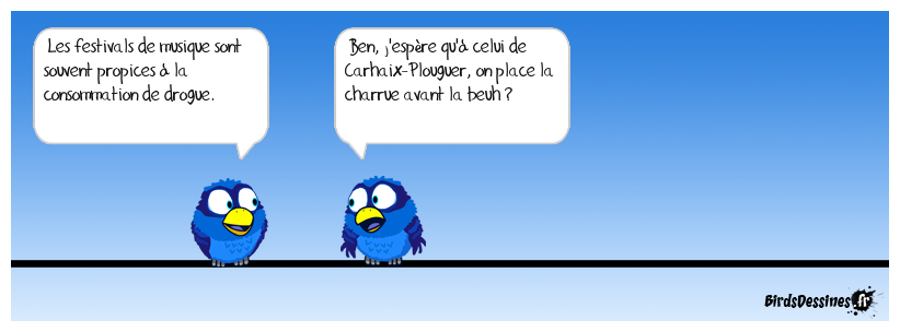 Case 1:Bird 1: Les festivals de musique sont souvent propices à la consommation de drogue. | Case 2: Bird 1: Ben, j'espère qu'à celui de Carhaix-Plouguer, on place la charrue avant la beuh ? | Case 3: