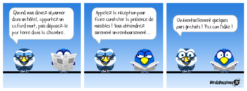 Case 1:Bird 1: Quand vous devez séjourner dans un hôtel, apportez un cafard mort, puis déposez-le par terre dans la chambre. | Case 2: Bird 1: Appelez la réception pour faire constater la présence de nuisibles ! Vous obtiendrez surement un remboursement... | Case 3: Bird 1: Ou éventuellement quelques jours gratuits ! Pas con l'idée !