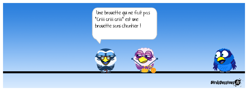 Case 1: | Case 2: Bird 1: Une brouette qui ne fait pas "Criii criii criii" est une brouette sans chantier ! | Case 3:
