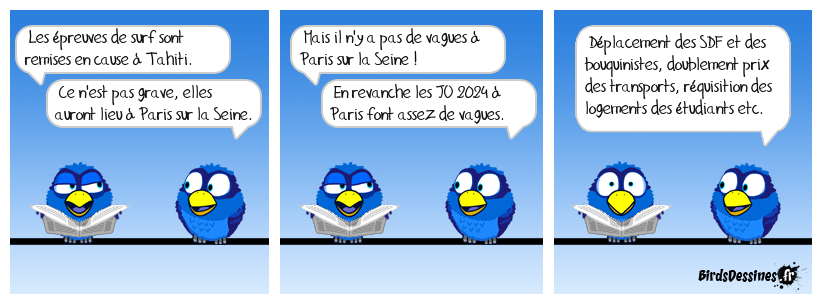 Case 1:Bird 1: Les épreuves de surf sont remises en cause à Tahiti.Bird 2: Ce n'est pas grave, elles auront lieu à Paris sur la Seine. | Case 2: Bird 1: Mais il n'y a pas de vagues à Paris sur la Seine ! Bird 2: En revanche les JO 2024 à Paris font assez de vagues. | Case 3: Bird 1: Déplacement des SDF et des bouquinistes, doublement prix des transports, réquisition des logements des étudiants etc.