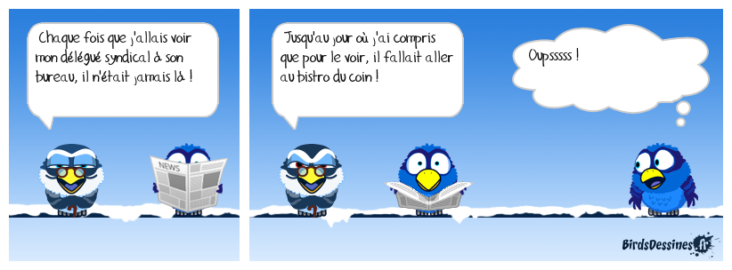 Case 1:Bird 1: Chaque fois que j'allais voir mon délégué syndical à son bureau, il n'était jamais là ! | Case 2: Bird 1: Jusqu'au jour où j'ai compris que pour le voir, il fallait aller au bistro du coin ! | Case 3: Bird 1: Oupsssss !