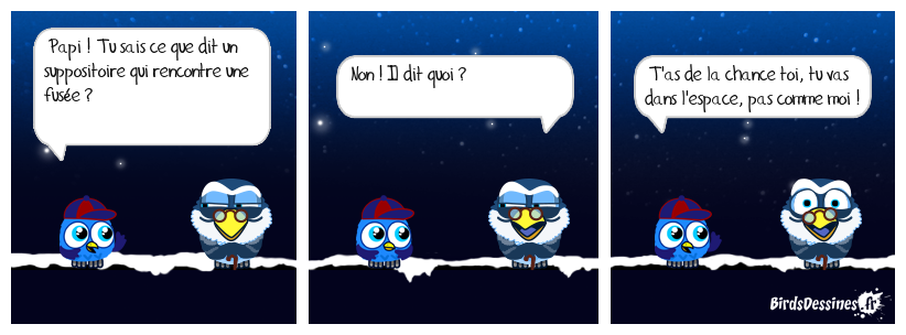 Case 1:Bird 1: Papi ! Tu sais ce que dit un suppositoire qui rencontre une fusée ? | Case 2: Bird 1: Non ! Il dit quoi ? | Case 3: Bird 1: T'as de la chance toi, tu vas dans l'espace, pas comme moi !