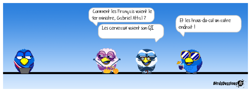 Case 1: | Case 2: Bird 1: Comment les Français voient le 1er ministre, Gabriel Attal ? Bird 2: Les cerveaux voient son QI | Case 3: Bird 1: Et les trous-du-cul un autre endroit !