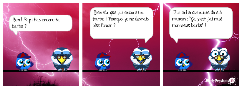 Case 1:Bird 1: Ben ! Papi t'as encore ta barbe ? | Case 2: Bird 1: Bien sûr que j'ai encore ma barbe ! Pourquoi je ne devrais plus l'avoir ? | Case 3: Bird 1: J'ai entendu mamie dire à maman : "Ça y est j'ai rasé mon vieux barbu" !