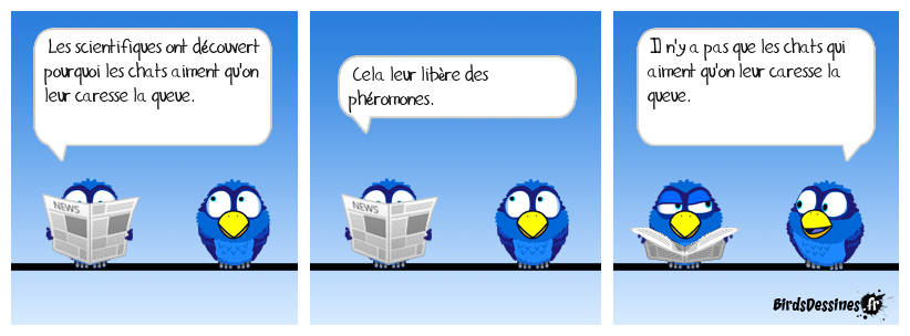 Case 1:Bird 1: Les scientifiques ont découvert pourquoi les chats aiment qu'on leur caresse la queue. | Case 2: Bird 1: Cela leur libère des phéromones. | Case 3: Bird 1: Il n'y a pas que les chats qui aiment qu'on leur caresse la queue.