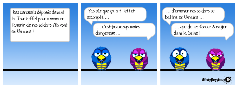 Case 1:Bird 1: Des cercueils déposés devant la Tour Eiffel pour annoncer l'avenir de nos soldats s'ils vont en Ukraine ! | Case 2: Bird 1: Pas sûr que ça ait l'effet escompté ... Bird 2: ... c'est beaucoup moins dangereux ... | Case 3: Bird 1: ... d'envoyer nos soldats se battre en Ukraine ... Bird 2: ... que de les forcer à nager dans la Seine !