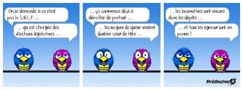 Case 1:Bird 1: On se demande si ce n'est pas la S.N.C.F ...Bird 2: ... qui est chargée des élections législatives ... | Case 2: Bird 1: ... ça commence déjà à dérailler de partout ... Bird 2: ... les wagons de queue veulent doubler ceux de tête ... | Case 3: Bird 1: ... les locomotives sont encore dans les dépôts ... Bird 2: ... et tous les signaux sont en panne !