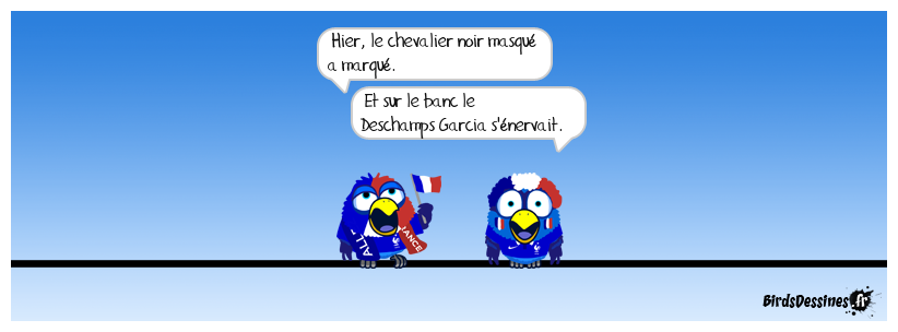 Case 1: | Case 2: Bird 1: Hier, le chevalier noir masqué a marqué. Bird 2: Et sur le banc le Deschamps Garcia s'énervait. | Case 3: