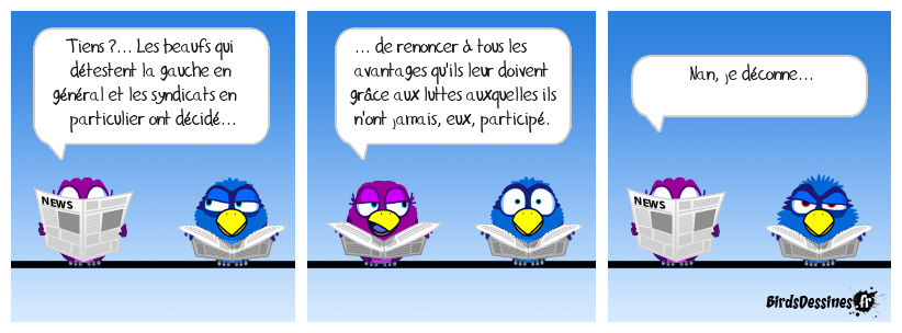 Case 1:Bird 1: Tiens ?... Les beaufs qui détestent la gauche en général et les syndicats en particulier ont décidé... | Case 2: Bird 1: ... de renoncer à tous les avantages qu'ils leur doivent grâce aux luttes auxquelles ils n'ont jamais, eux, participé. | Case 3: Bird 1: Nan, je déconne...