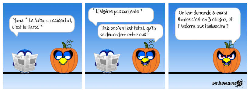Case 1:Bird 1: Manu: « Le Sahara occidental, c’est le Maroc » | Case 2: Bird 1: « L’Algérie pas contente » Bird 2: Mais on s’en fout total, qu’ils se démerdent entre eux ! | Case 3: Bird 1: On leur demande à eux si Nantes c’est en Bretagne, et l’Andorre aux toulousains ?