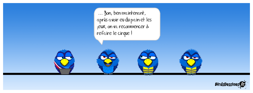 Case 1: | Case 2: Bird 1: ... Bon, ben maintenant, après avoir eu du pain et les jeux, on va recommencer à refaire le cirque ! | Case 3: