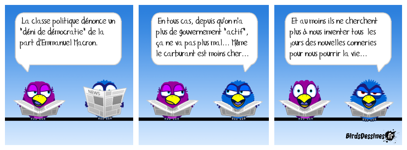 Case 1:Bird 1: La classe politique dénonce un "déni de démocratie" de la part d'Emmanuel Macron. | Case 2: Bird 1: En tous cas, depuis qu'on n'a plus de gouvernement "actif", ça ne va pas plus mal... Même le carburant est moins cher... | Case 3: Bird 1: Et au moins ils ne cherchent plus à nous inventer tous les jours des nouvelles conneries pour nous pourrir la vie...