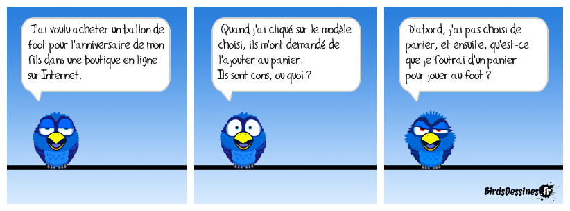 Case 1:Bird 1: J'ai voulu acheter un ballon de foot pour l'anniversaire de mon fils dans une boutique en ligne sur Internet. | Case 2: Bird 1: Quand j'ai cliqué sur le modèle choisi, ils m'ont demandé de l'ajouter au panier. Ils sont cons, ou quoi ? | Case 3: Bird 1: D'abord, j'ai pas choisi de panier, et ensuite, qu'est-ce que je foutrai d'un panier pour jouer au foot ?