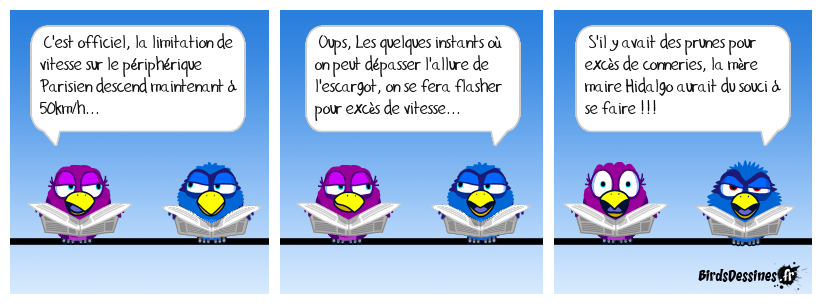 Case 1:Bird 1: C'est officiel, la limitation de vitesse sur le périphérique Parisien descend maintenant à 50km/h... | Case 2: Bird 1: Oups, Les quelques instants où on peut dépasser l'allure de l'escargot, on se fera flasher pour excès de vitesse... | Case 3: Bird 1: S'il y avait des prunes pour excès de conneries, la mère maire Hidalgo aurait du souci à se faire !!!