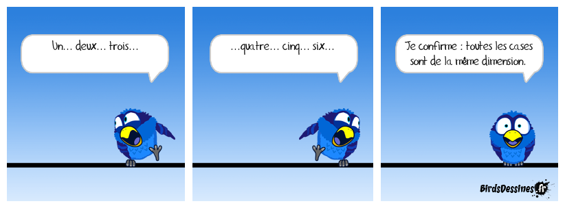 Case 1:Bird 1: Un... deux... trois... | Case 2: Bird 1: ...quatre... cinq... six... | Case 3: Bird 1: Je confirme : toutes les cases sont de la même dimension.