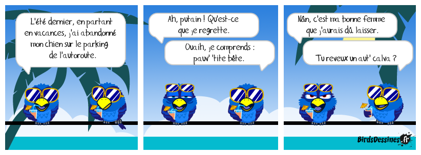 Case 1:Bird 1: L'été dernier, en partant en vacances, j'ai abandonné mon chien sur le parking de l'autoroute. | Case 2: Bird 1: Ah, putain ! Qu'est-ce que je regrette. Bird 2: Ouaih, je comprends : pauv' 'tite bête. | Case 3: Bird 1: Nân, c'est ma bonne femme que j'aurais dû laisser. Bird 2: Tu reveux un aut' calva ?