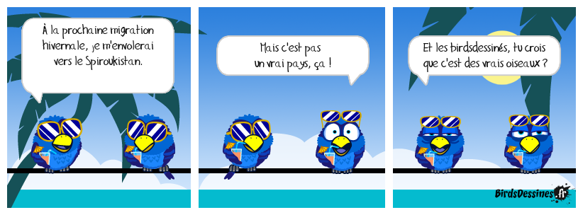 Case 1:Bird 1: À la prochaine migration hivernale, je m'envolerai vers le Spiroukistan. | Case 2: Bird 1: Mais c'est pas un vrai pays, ça ! | Case 3: Bird 1: Et les birdsdessinés, tu crois que c'est des vrais oiseaux ?
