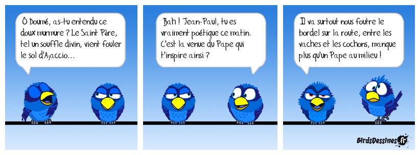 Case 1:Bird 1: Ô Doumé, as-tu entendu ce doux murmure ? Le Saint Père, tel un souffle divin, vient fouler le sol d'Ajaccio... | Case 2: Bird 1: Bah ! Jean-Paul, tu es vraiment poétique ce matin. C'est la venue du Pape qui t'inspire ainsi ? | Case 3: Bird 1: Il va surtout nous foutre le bordel sur la route, entre les vaches et les cochons, manque plus qu'un Pape au milieu !