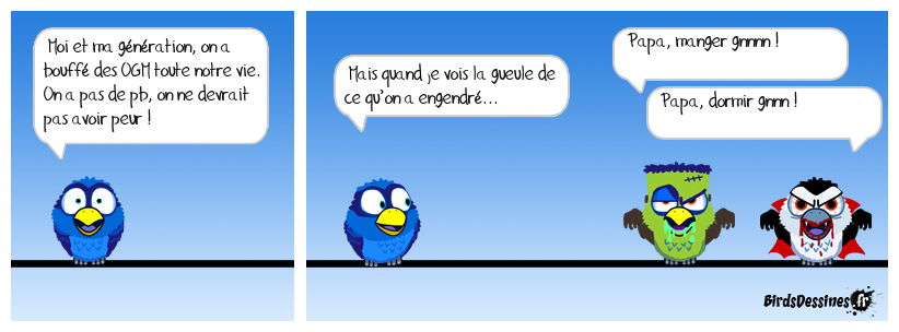 Case 1:Bird 1: Moi et ma génération, on a bouffé des OGM toute notre vie. On a pas de pb, on ne devrait pas avoir peur ! | Case 2: Bird 1: Mais quand je vois la gueule de ce qu’on a engendré... | Case 3: Bird 1: Papa, manger gnnnn ! Bird 2: Papa, dormir gnnn !
