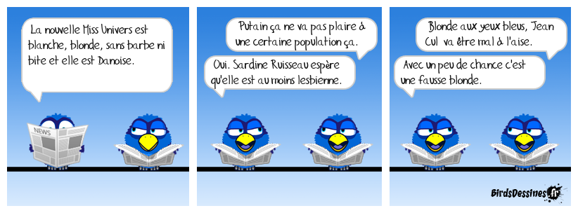 Case 1:Bird 1: La nouvelle Miss Univers est blanche, blonde, sans barbe ni bite et elle est Danoise. | Case 2: Bird 1: Putain ça ne va pas plaire à une certaine population ça. Bird 2: Oui. Sardine Ruisseau espère qu'elle est au moins lesbienne. | Case 3: Bird 1: Blonde aux yeux bleus, Jean Cul va être mal à l'aise. Bird 2: Avec un peu de chance c'est une fausse blonde.