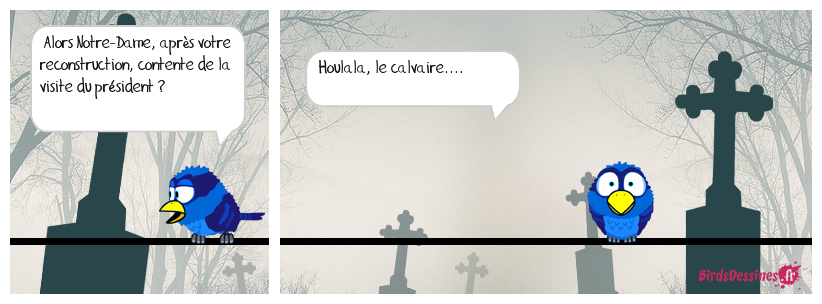 Case 1:Bird 1: Alors Notre-Dame, après votre reconstruction, contente de la visite du président ? | Case 2: Bird 1: Houlala, le calvaire.... | Case 3: