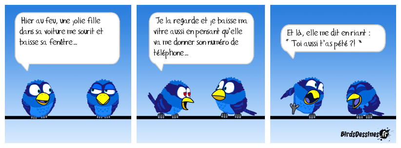 Case 1:Bird 1: Hier au feu, une jolie fille dans sa voiture me sourit et baisse sa fenêtre… | Case 2: Bird 1: Je la regarde et je baisse ma vitre aussi en pensant qu’elle va me donner son numéro de téléphone… | Case 3: Bird 1: Et là, elle me dit en riant : « Toi aussi t’as pété ?! »