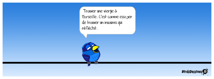 Case 1: | Case 2: Bird 1: Trouver une vierge à Marseille. C'est comme essayer de trouver un insoumis qui réfléchit. | Case 3: