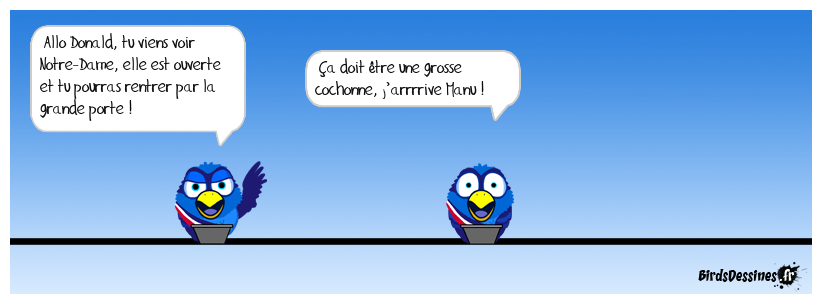 Case 1:Bird 1: Allo Donald, tu viens voir Notre-Dame, elle est ouverte et tu pourras rentrer par la grande porte ! | Case 2: Bird 1: Ça doit être une grosse cochonne, j’arrrrive Manu ! | Case 3: