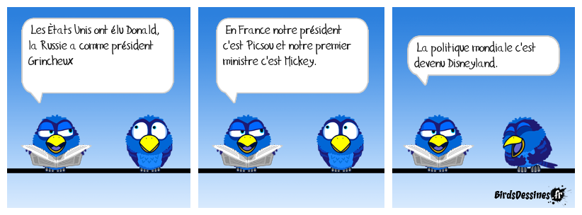 Case 1:Bird 1: Les États Unis ont élu Donald, la Russie a comme président Grincheux | Case 2: Bird 1: En France notre président c'est Picsou et notre premier ministre c'est Mickey. | Case 3: Bird 1: La politique mondiale c'est devenu Disneyland.