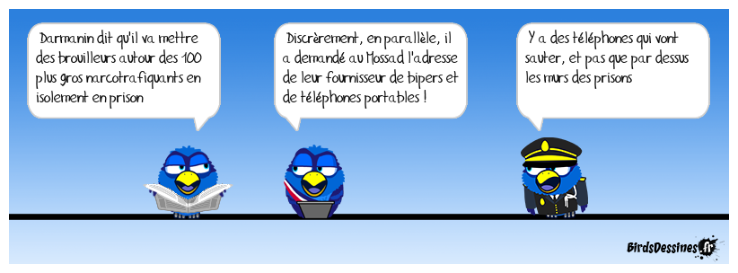 Case 1:Bird 1: Darmanin dit qu'il va mettre des brouilleurs autour des 100 plus gros narcotrafiquants en isolement en prison | Case 2: Bird 1: Discrèrement, en parallèle, il a demandé au Mossad l'adresse de leur fournisseur de bipers et de téléphones portables ! | Case 3: Bird 1: Y a des téléphones qui vont sauter, et pas que par dessus les murs des prisons