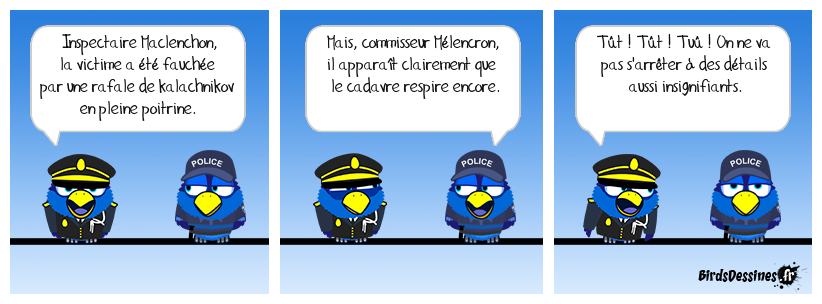 Case 1:Bird 1: Inspectaire Maclenchon, la victime a été fauchée par une rafale de kalachnikov en pleine poitrine. | Case 2: Bird 1: Mais, commisseur Mélencron, il apparaït clairement que le cadavre respire encore. | Case 3: Bird 1: Tût ! Tût ! Tuû ! On ne va pas s'arrêter à des détails aussi insignifiants.