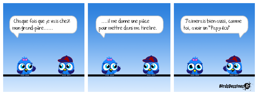 Case 1:Bird 1: Chaque fois que je vais chez mon grand-père...... | Case 2: Bird 1: ....il me donne une pièce pour mettre dans ma tirelire. | Case 3: Bird 1: J'aimerais bien aussi, comme toi, avoir un "Papy écu"