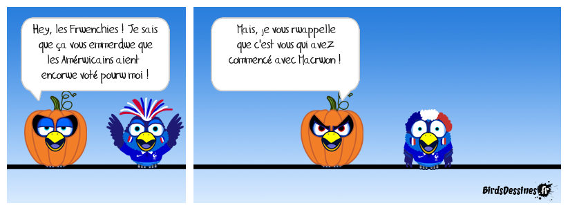 Case 1:Bird 1: Hey, les Frwenchies ! Je sais que ça vous emmerdwe que les Amérwicains aient encorwe voté pourw moi ! | Case 2: Bird 1: Mais, je vous rwappelle que c'est vous qui avez commencé avec Macrwon ! | Case 3: