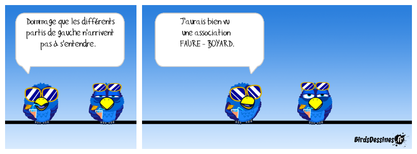 Case 1:Bird 1: Dommage que les différents partis de gauche n'arrivent pas à s'entendre. | Case 2: Bird 1: J'aurais bien vu une association FAURE - BOYARD. | Case 3: