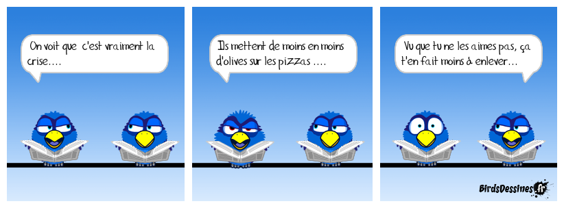 Case 1:Bird 1: On voit que c'est vraiment la crise.... | Case 2: Bird 1: Ils mettent de moins en moins d'olives sur les pizzas .... | Case 3: Bird 1: Vu que tu ne les aimes pas, ça t'en fait moins à enlever...
