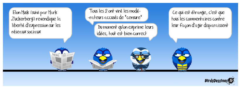 Case 1:Bird 1: Elon Musk (suivi par Mark Zuckerberg) revendique la liberté d'expression sur les réseaux sociaux | Case 2: Bird 1: Tous les 2 ont viré les modé- -rateurs accusés de "censure" Bird 2: Du moment qu'on exprime leurs idées, tout est bien correct | Case 3: Bird 1: Ce qui est étrange, c'est que tous les commentaires contre leur façon d'agir disparaissent