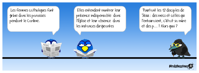 Case 1:Bird 1: Les femmes catholiques font grève dans les paroisses pendant le Carême. | Case 2: Bird 1: Elles entendent montrer leur présence indispensable dans l'Èglise et leur absence dans les instances dirigeantes | Case 3: Bird 1: Pourtant les 12 disciples de Jésus : des mecs et celles qui l'entouraient, c'était sa mère et des p... ! Alors quoi ?